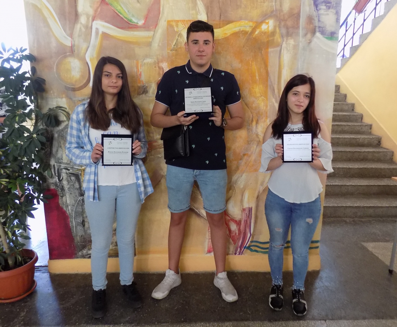 На снимката: Йоанна Великова - приз "Спортист на Випуск 2020"; Траян Суров - приз "За активна гражданска позиция"; Гергана Златева - приз "Първенец на Випуск 2020".