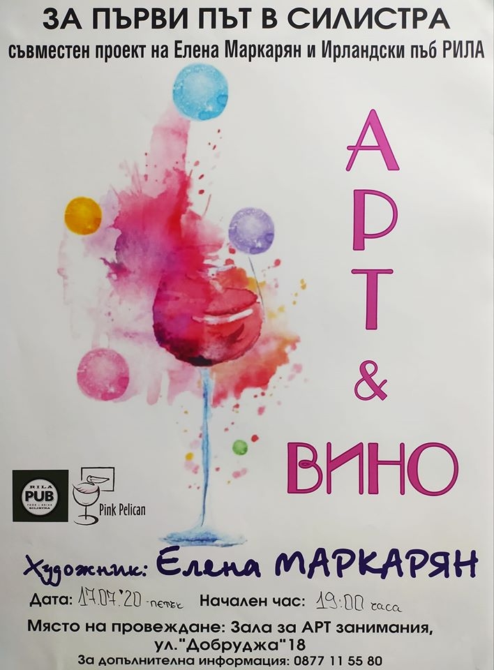 Днес от 19.00 часа в залата за арт занимания на ул. Добруджа" 18, намиращ се в Ирлански пъб РИЛА ще се проведе експеримент-предизвикателство "Арт & вино" - една проява на художничката Елена Маркарян и на Изба на колела "Пинк пеликан".