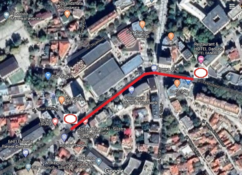 От община Силистра съобщават, че ще бъде затворен за движение на МПС участък по ул. "Симеон Велики", от хотел "DANUBE" /по ул. "Добруджа"/ до кръстовището на ул. "Симеон Велики" с ул. "Шар Планина" на 16.08.2020 г. /неделя/ от 08:00 ч. до приключване на дейностите по полагането на нова пътна маркировка,
