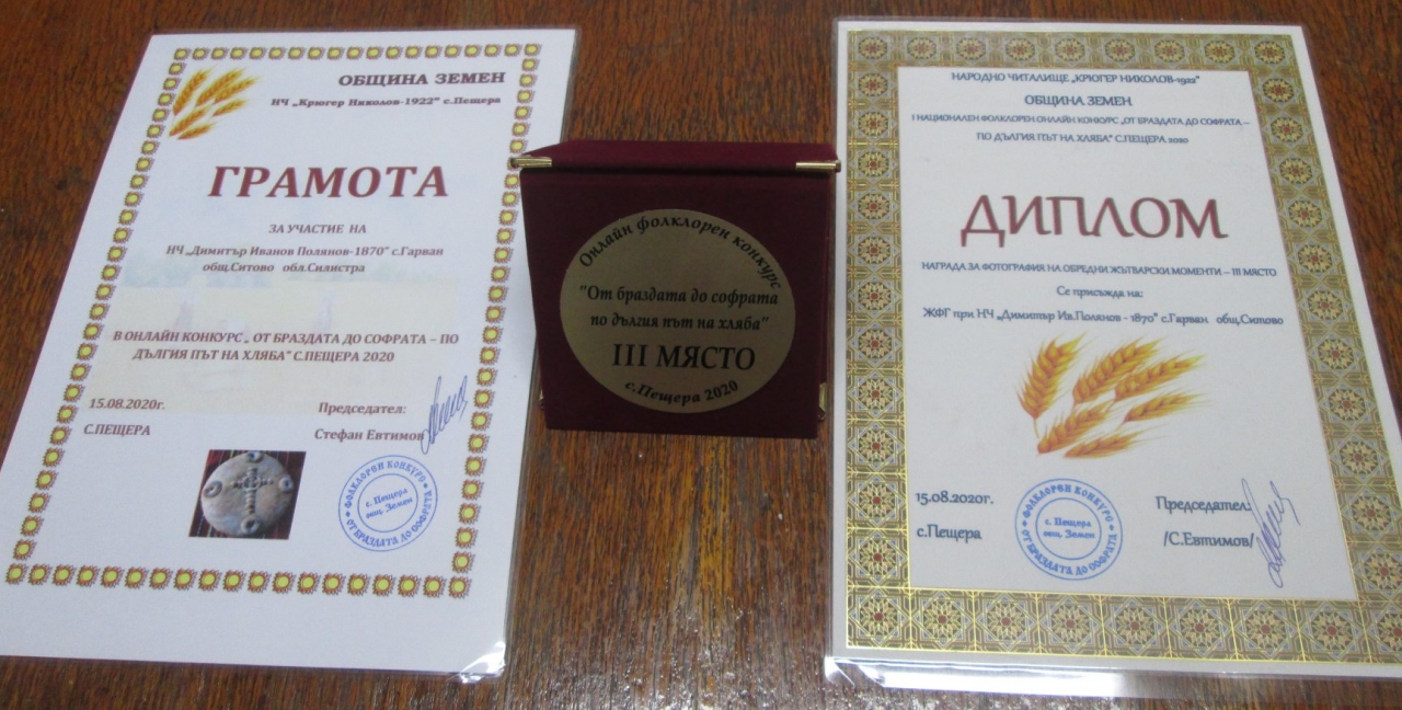 НЧ "Димитър Полянов" село Гарван: Спечелено трето място в раздел "Фотографии на обредни жетварски моменти и хлябове" в Първи Национален онлайн празник - фолклорен конкурс "От браздата до софрата – "По дългия път на хляба" – Пещера,2020 г., община Земен, област Перник.