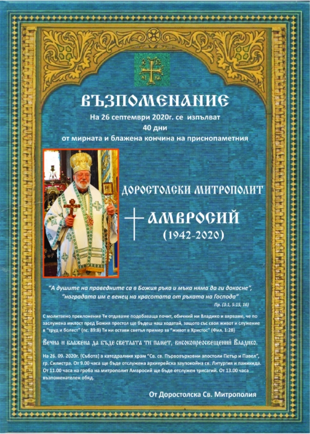 Доростолският епархийски съвет известява епархиотите на Доростолска епархия, че на 26-ти септември се навършват 40 дни от блажената кончина на Негово Високопреосвещенство Доростолски митрополит Амвросий, съобщава официалният сайт на Св. Синод.