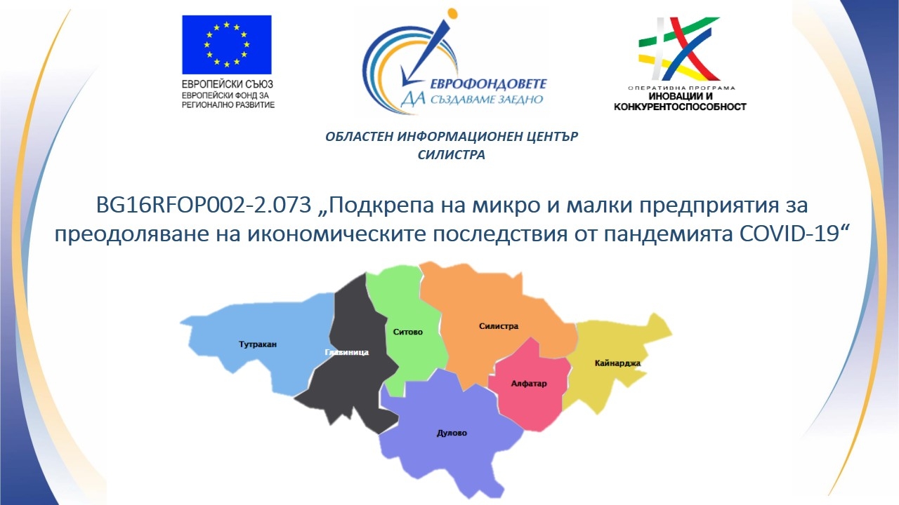 146 административни договора на обща стойност 1 177 496 лв. са сключени в област Силистра за предоставяне на безвъзмездна финансова помощ по процедура BG16RFOP002-2.073 "ПОДКРЕПА НА МИКРО И МАЛКИ ПРЕДПРИЯТИЯ ЗА ПРЕОДОЛЯВАНЕ НА ИКОНОМИЧЕСКИТЕ ПОСЛЕДСТВИЯ ОТ ПАНДЕМИЯТА COVID-19" на Оперативна програма "Иновации и конкурентоспособност" 2014-2020.