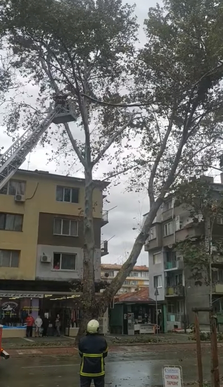Нейни екипи са отстранили повалени дървета по ул. "Симеон Велики" и ул. "Петър Мутафчиев", опасно наклонени дървета и клони по ул. "Симеон Велики" и ул. "Пирин", както и са обезопасили със сигнална лента района около училищна сграда по ул. "Добрич" заради надвиснали ламарини от покрива ѝ. Във два от случаите е използвана автомеханична стълба. Същевременно е погасен пожар в контейнер за смет по ул. "Добруджа", възникнал около 14:10 часа.