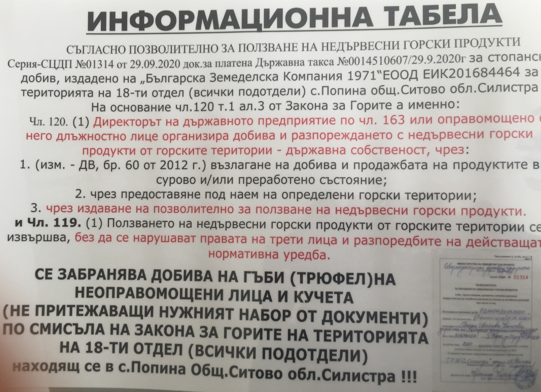 -Директора на държавното предприятие по чл.163 или оправомощено от него лице организира добива и разпореждането с недървесни горски продукти на територии държавна собственост чрез: т.3-Издаване на позволително за ползване на недървесни горски продукти. Ни беше учредено право на стопански добив на гъби на основание "Позво-лително за ползване на недървесни горски продукти" серия СЦДП №1314 от 29.09.2020г. Считаме че реда и начина за получаване на право за стопански добив на гъби определен от Законодателя е спазен от наша страна и от страна на ТП ДГС/ ДЛС Силистра.