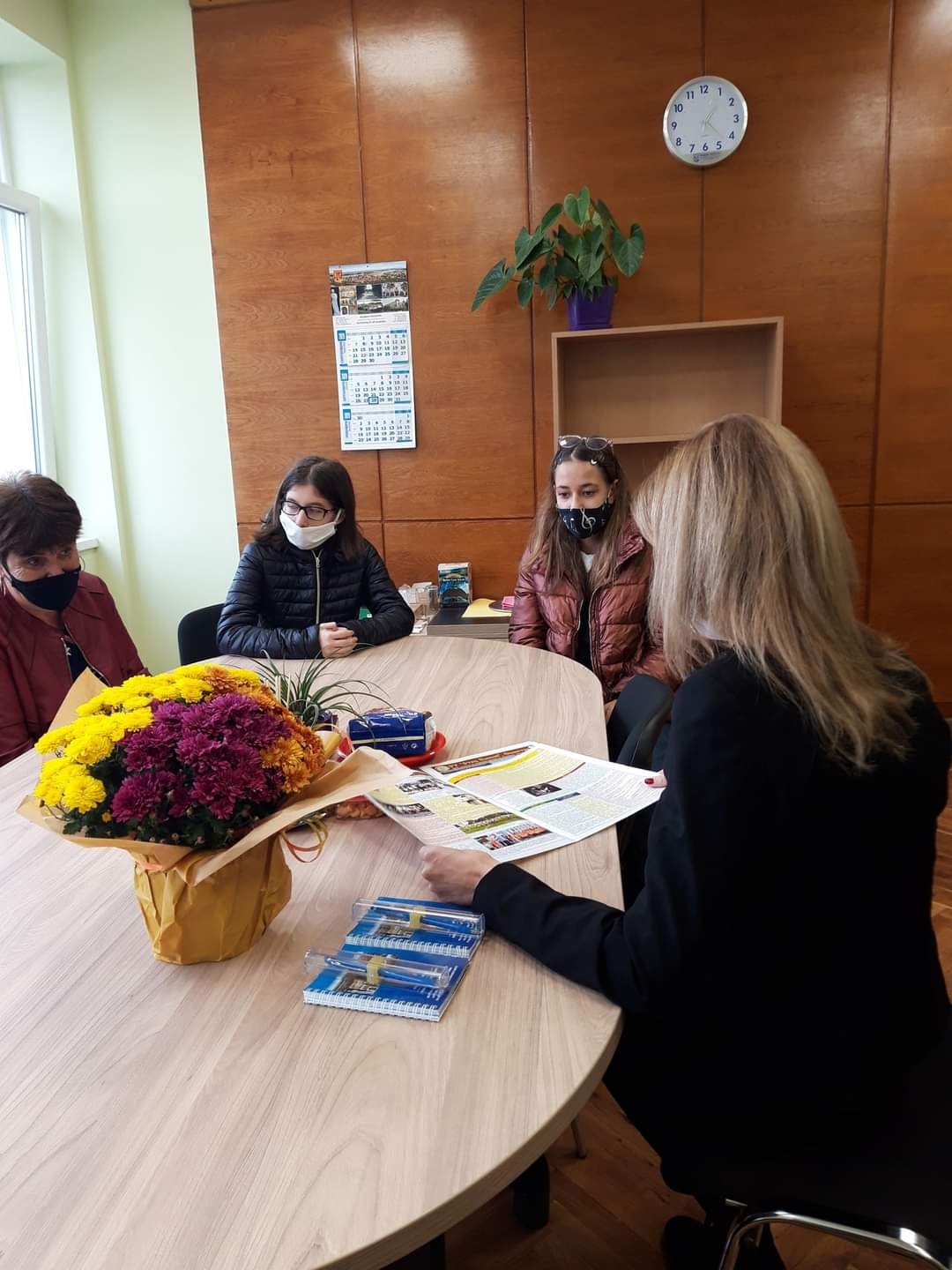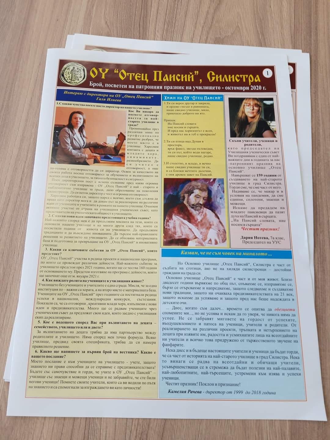 Дария Нотева от 7-ми А клас - Председател на училищния ученически съвет и Елвира Симеонова, също от 7-ми А клас - секретар на училищния ученически съвет, представиха вестника, посветен на патронния празник на училището - 29-ти октомври, което ще отбележи 159 години от основаването си.
