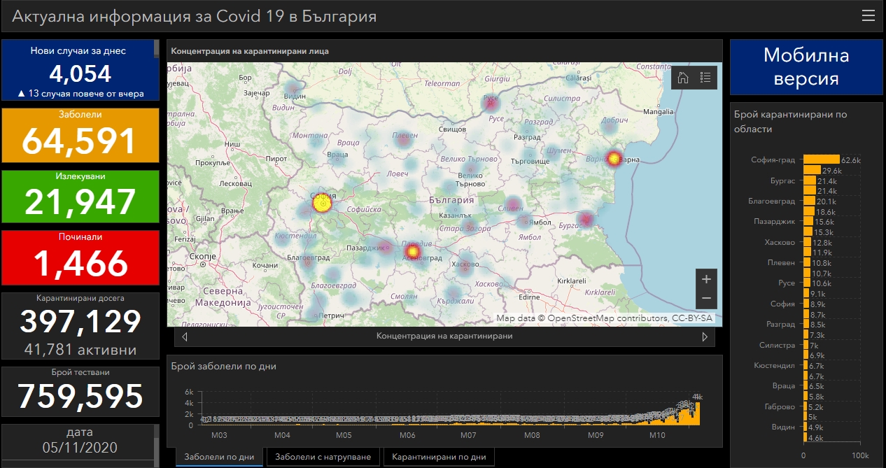Разпределението по области по настоящ адрес на лицата е, както следва: Благоевград - 188; Бургас - 141; Варна - 204; Велико Търново - 91; Видин - 25; Враца - 121; Габрово - 90; Добрич - 24; Кърджали - 37; Кюстендил - 66; Ловеч - 78; Монтана - 81; Пазарджик - 71; Перник - 65; Плевен - 85; Пловдив - 310; Разград - 54; Русе - 141; Силистра - 53; Сливен - 86; Смолян - 30; София област - 98; София (град) - 1477; Стара Загора - 205; Търговище - 54; Хасково - 61; Шумен - 74; Ямбол - 44. 403 са излекуваните през последното денонощие, а общият им брой е 21 947. Хоспитализираните лица са 3 191, от които 239 се намират в интензивното отделение.