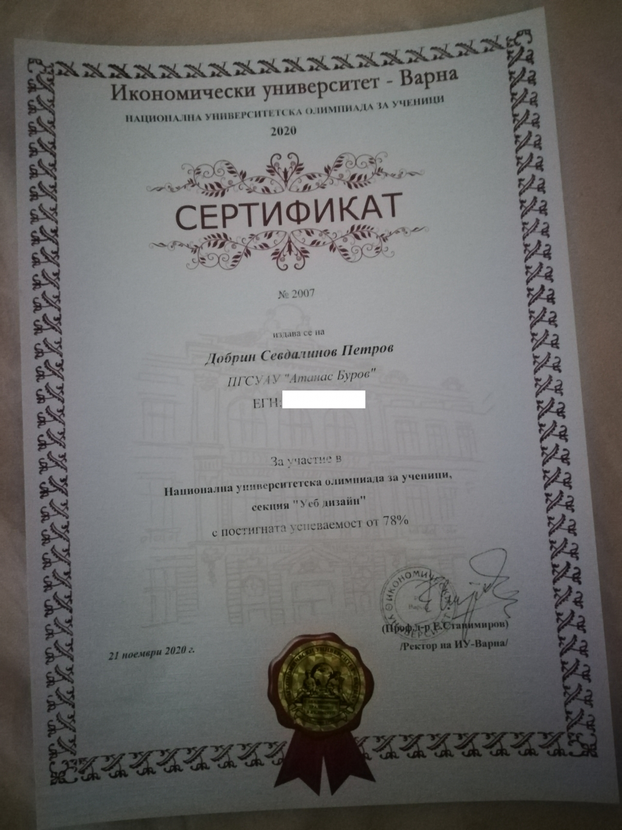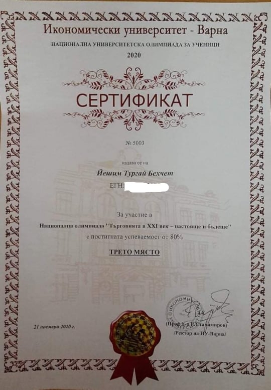 В Национална олимпиада "Търговията в XXI век – настояще и бъдеще" престижното 3-то място зае Йешим Бехчет от 11а клас с проект на тема "МОЯТ БЪДЕЩ ТЪРГОВСКИ БИЗНЕС".