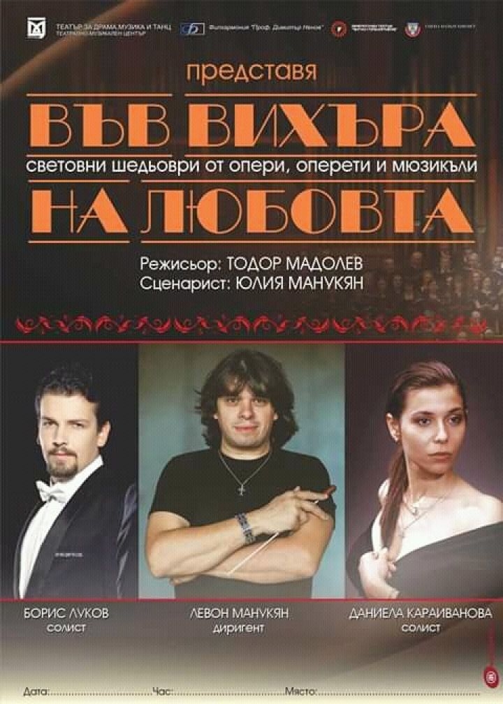 Театрално – Музикален център Разград и разградската филхармония "Димитър Ненов" с диригент Лeвон Манукян гостуват на 22.12 /вторник/ от 19.00 часа в залата на СУ "Н.Й.Вапцаров" в Силистра с концерт-спектакъла "Във вихъра на любовта".
