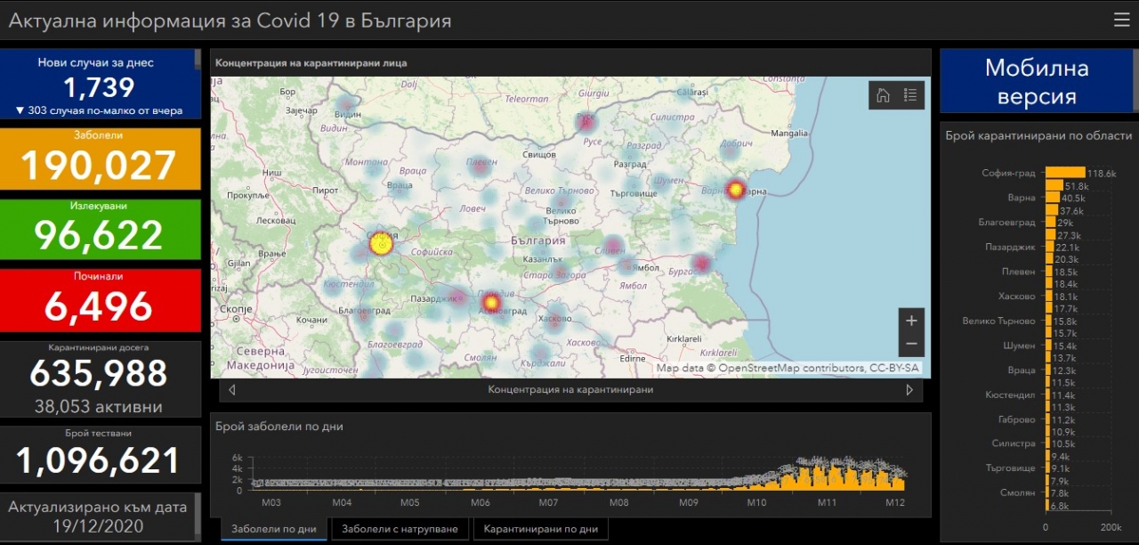 1739 души са с положителни проби за коронавирус при направените през последното денонощие 6190 PCR теста, което е 28% от всички проби, сочат данните на Единния информационен портал към 00:00 ч. на 19 декември.