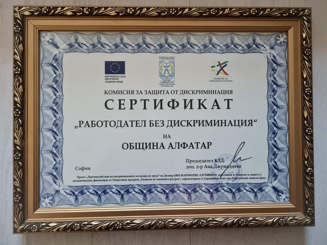 Кметът на община Алфатар получи сертификат за "Работодател без дискриминация"