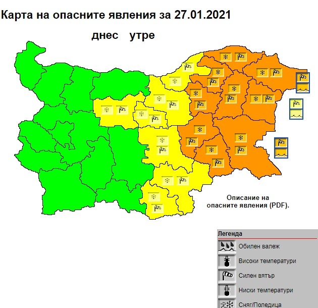 Предупреждение от втора степен – оранжев код – е в сила освен за Силистра и за Разград, Шумен, Търговище, Добрич Варна, Бургас, Сливен и Ямбол. Жълт код е обявен за областите Русе, Велико Търново, Габрово, Ловеч, Стара Загора, Хасково и Кърджали.
