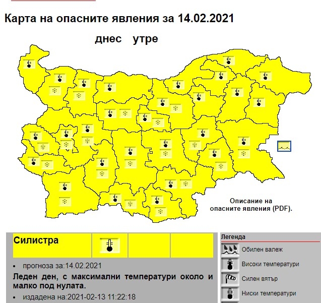 Жълт код за ниски температури е обявен в Силистренска област за днес и утре.