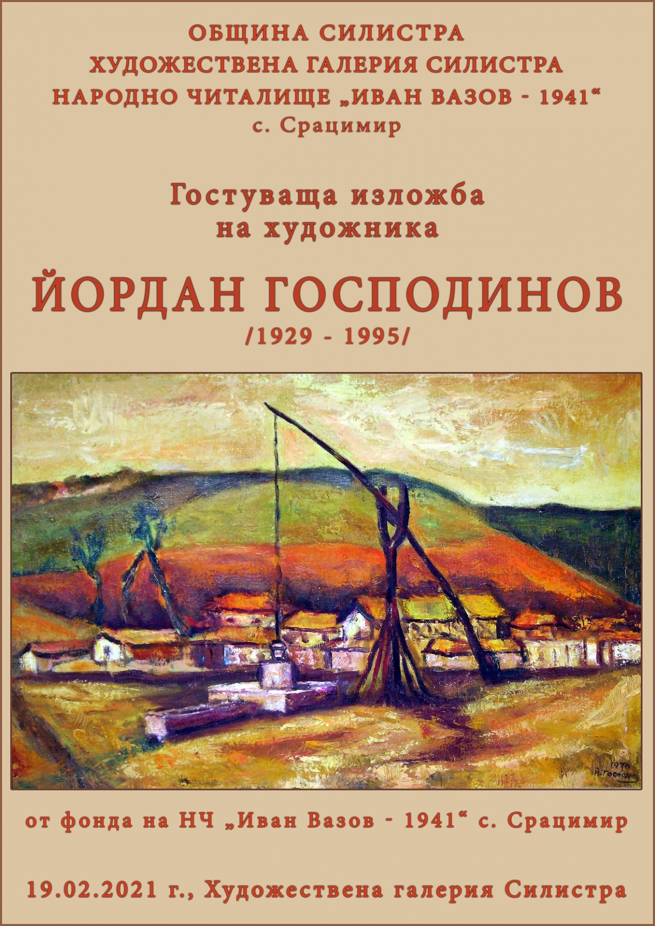 Гостуваща изложба в Художествена галерия Силистра с картини на Йордан Господинов /1929 - 1995/ от фонда на НЧ "Иван Вазов" - село Срацимир. Художествена галерия Силистра представя на своята публика експозицият, включваща 32 живописни платна, които са от фонда на читалището. Изложбата ще бъде достъпна за гражданите и гостите на града от 19. 02. /петък/ 2021 г. при спазване на всички противоепидемични мерки.