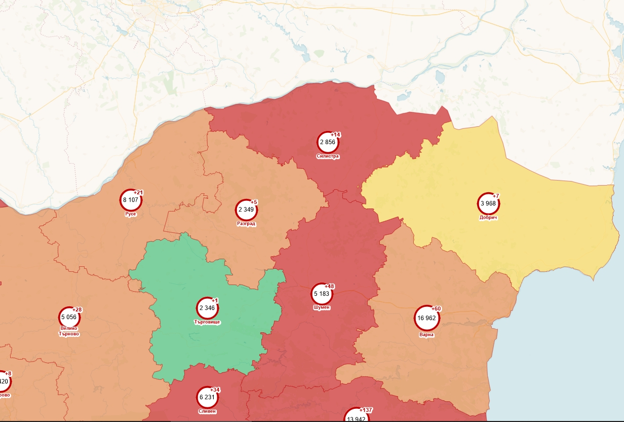 Оранжев е кодът в Разград, а най-малко инфектирани и тази седмица са отчетени в Търговище. Там цветът е зелен.