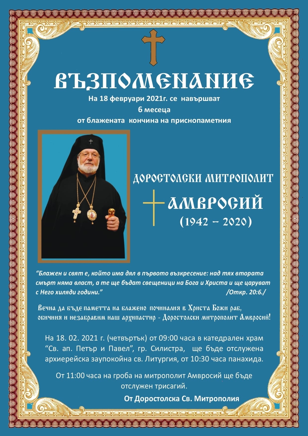 Звън на камбани, прочувствено слово и панихида в катедрален храм "Св. св. първоапостоли "Петъри Павел" в Силистра и ритуал "трисагий" (тропари, кратка заупокойна ектения и молитва) в двора на църквата в чест на митрополит Амвросий – 6 месеца след кончината му миналата година.