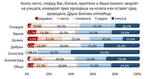 По отношение на замърсяването с хранителни отпадъци и други битови отпадъци най-неблагоприятно е положението в Шумен, с дялове съответно 15% и 14%, а Силистра отново регистрира най-високи дялове опазващи околната среда със стойности съответно 51% и 61%, деклариращи че техните близки и познати никога не изхвърлят този вид отпадъци.