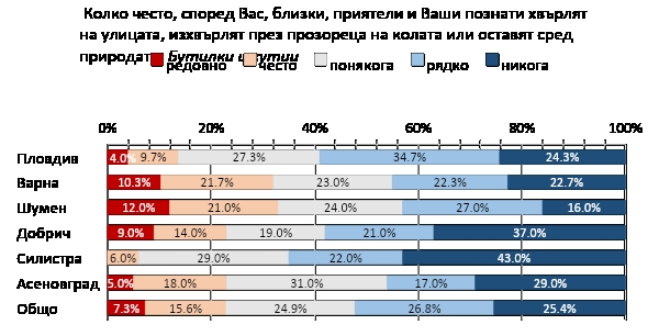 По отношение на изхвърляните празни бутилки и кутии отново води Силистра с цели 43% от анкетираните, следвана от Добрич с 37%. Асеновград тук е трети с 29% въздържащи се от замърсяване на околната среда по този показател, а Шумен е последен с 16%!