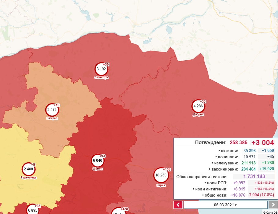 Така общият брой на потвърдените случаи става 258 385, от които активни са 35 896. 1280 са излекуваните през последното денонощие, а общият им брой е 211 918. Ваксинираните са общо 284 464, като за последното денонощие са 15 920. Хоспитализираните са 5463, от които 437 се намират в интензивното отделение.