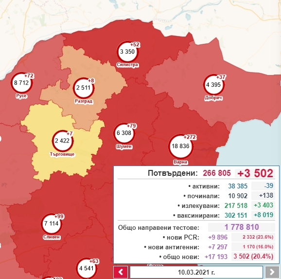 3502 са новите случаи на коронавирус у нас при направени 17 193 теста. Положителни са над 20% от пробите, показват данните в единния информационен портал.