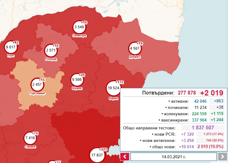 2019, с 1140 случая по-малко от вчера, са новодиагностицираните с коронавирусна инфекция лица през изминалите 24 часа. За последното денонощие са направени общо 10 614 теста, oт които 7320 са PCR, а 3294 са с бърз антигенен тест. Това показват данните в Националната информационна система. Така общият брой на потвърдените случаи става 277 878, от които активни са 42 046. 1118 са излекуваните през последното денонощие, а общият им брой е 224 598. Поставените дози ваксини са общо 337 904, като 1 244 лица са ваксинирани за денонощието. 57767 са общо лицата, ваксинирани с втора доза. Хоспитализираните са 6 948, от които 522 се намират в интензивното отделение. Починалите с доказана коронавирусна инфекция са общо 11 234. 38 от случаите са от последните 24 часа.