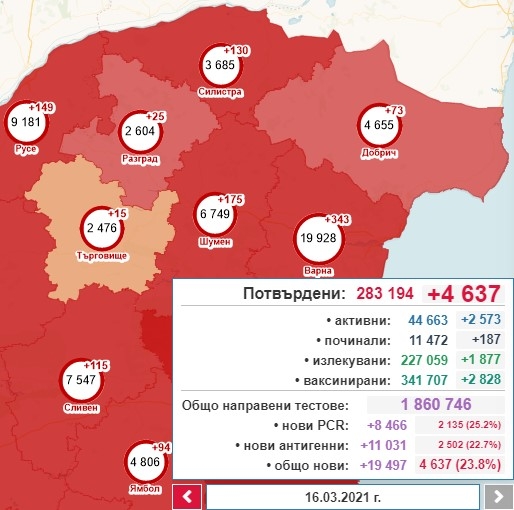 4637, с 3958 случая повече от вчера, са новодиагностицираните с коронавирусна инфекция лица през изминалите 24 часа. За последното денонощие са направени общо 19 497 теста, oт които 8466 са PCR, а 11 031 са с бърз антигенен тест. Това показват данните в Националната информационна система. Така общият брой на потвърдените случаи става 283 194, от които активни са 44 663. 1877 са излекуваните през последното денонощие, а общият им брой е 227 059. Поставените дози ваксини са общо 341 707, като 2828 лица са ваксинирани за денонощието. 59 994 са общо лицата, ваксинирани с втора доза. Хоспитализираните са 7269, от които 577 се намират в интензивното отделение. Починалите с доказана коронавирусна инфекция са общо 11 472. 187 от случаите са от последните 24 часа.