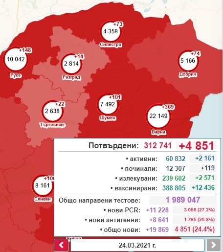 4 851 са новодиагностицираните с коронавирусна инфекция през изминалите 24 часа. Това са 24,4% от тестваните. За последното денонощие са направени общо 19 869 теста, oт които 11 228 са PCR, а 8 641 са с бърз антигенен тест. Това показват данните в Националната информационна система. Така общият брой на потвърдените случаи става 312 741, от които активни са 60 832. 2571 са излекуваните през последното денонощие, а общият им брой е 239 602. Поставените дози ваксини са общо 388 805, като 12 436 лица са ваксинирани за денонощието. Хоспитализираните са 8 927, от които 729 се намират в интензивното отделение. Починалите с доказана коронавирусна инфекция са общо 12 307. 119 от случаите са от последните 24 часа.