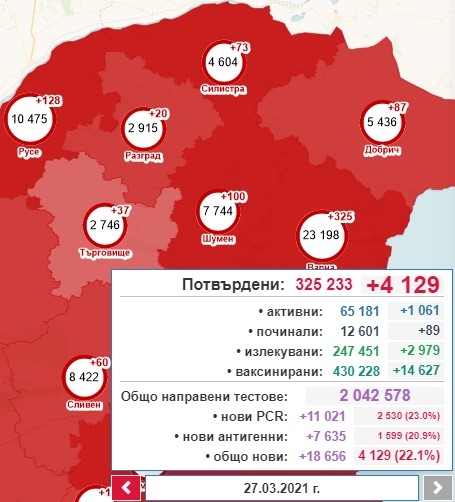 4129, със 141 случая повече от вчера, са новодиагностицираните с коронавирусна инфекция през изминалите 24 часа. Това са 22,1% от тестваните. За последното денонощие са направени общо 18 656 теста, oт които 11 021 са PCR, а 7635 са с бърз антигенен тест. Това показват данните в Националната информационна система. Така общият брой на потвърдените случаи става 325 233, от които активни са 65 181. 2979 са излекуваните през последното денонощие, а общият им брой е 247 451. Поставените дози ваксини са общо 430 228, като 14 627 са ваксинирани за денонощието. Хоспитализираните са 9430, от които 751 се намират в интензивното отделение. Починалите с доказана коронавирусна инфекция са общо 12 601. 89 от случаите са от последните 24 часа.