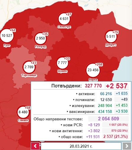 2537, със 1592 случая по-малко от вчера, са новодиагностицираните с коронавирусна инфекция през изминалите 24 часа. Това са 21,3% от тестваните. За последното денонощие са направени общо 11 931 теста, oт които 8129 са PCR, а 3802 са с бърз антигенен тест. Това показват данните в Националната информационна система. Така общият брой на потвърдените случаи става 327 770, от които активни са 66 216. 1453 са излекуваните през последното денонощие, а общият им брой е 248 904. Поставените дози ваксини са общо 434 158, като 3930 са ваксинирани за денонощието. Хоспитализираните са 9674, от които 769 се намират в интензивното отделение. Починалите с доказана коронавирусна инфекция са общо 12 650. 49 от случаите са от последните 24 часа.