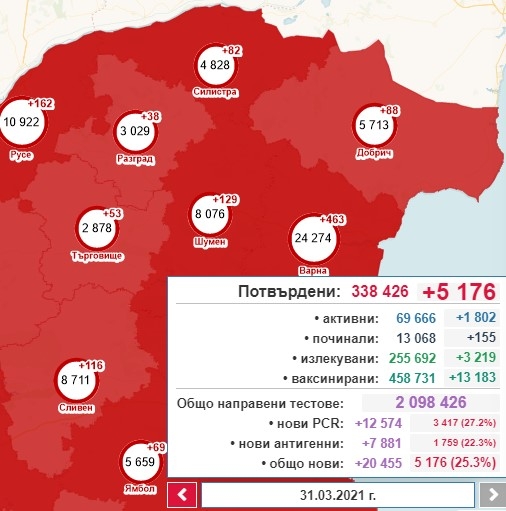 5176 са новодиагностицираните с коронавирусна инфекция през изминалите 24 часа. Това са 25.3% от тестваните. За последното денонощие са направени общо 20 455 теста, oт които 12574 са PCR, а 7881 са с бърз антигенен тест. Това показват данните в Националната информационна система. Така общият брой на потвърдените случаи става 338,426, от които активни са 69 666. 3219 са излекуваните през последното денонощие, а общият им брой е 255,692. Поставените дози ваксини са общо 458 731, като 13 183 са ваксинирани за денонощието.