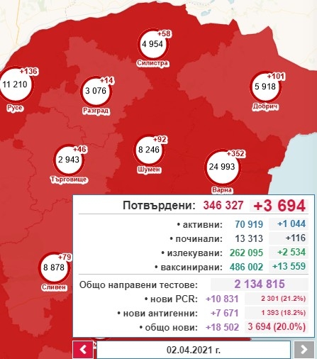 3694, с 513 случая по-малко от вчера, са новодиагностицираните с коронавирусна инфекция през изминалите 24 часа. Това са 20% от тестваните. За последното денонощие са направени общо 18 502 теста, oт които 10 831 са PCR, а 7671 са с бърз антигенен тест. Това показват данните в Националната информационна система. Така общият брой на потвърдените случаи става 346 327, от които активни са 70 919. 2534 са излекуваните през последното денонощие, а общият им брой е 262 095. Поставените дози ваксини са общо 486 002, като 13 559 са ваксинирани за денонощието. Хоспитализираните са 10 152, от които 747 се намират в интензивното отделение. Починалите с доказана коронавирусна инфекция са общо 13 313. 116 от случаите са от последните 24 часа.