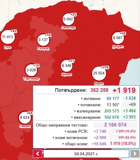 Разпределение на болните по настоящ адрес следва по този ред: в София столица - 481, Бургас - 256, Варна - 216, Пловдив - 161. 10 521 са пациентите в болница. 758 от тях са в интензивни отделения на болниците. Излекуваните са с 3484 повече или общо 269 575. 13 507 са починалите от коронавирус до момента в страната. 502 078 са вече общо поставените дози ваксини. 3993 дози са от последното денонощие.