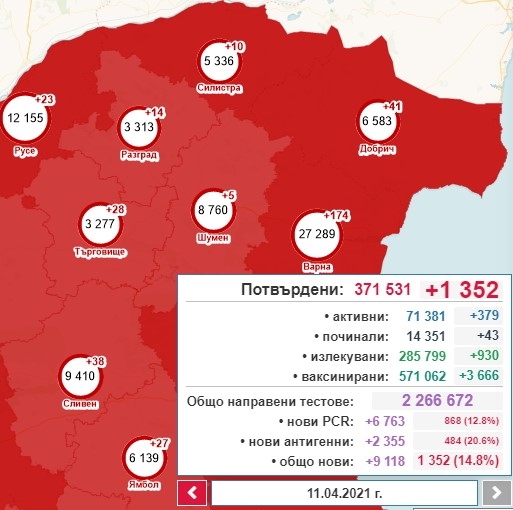 Така общият брой на потвърдените случаи става 371 531, от които активни са 71 381. 930 са излекуваните през последното денонощие, а общият им брой е 285 799. Поставените дози ваксини са общо 571 062, като 3 666 са ваксинирани за денонощието. Хоспитализираните са 10 365, от които 801 се намират в интензивното отделение. Починалите с доказана коронавирусна инфекция са общо 14 351. 43 от случаите са от последните 24 часа.