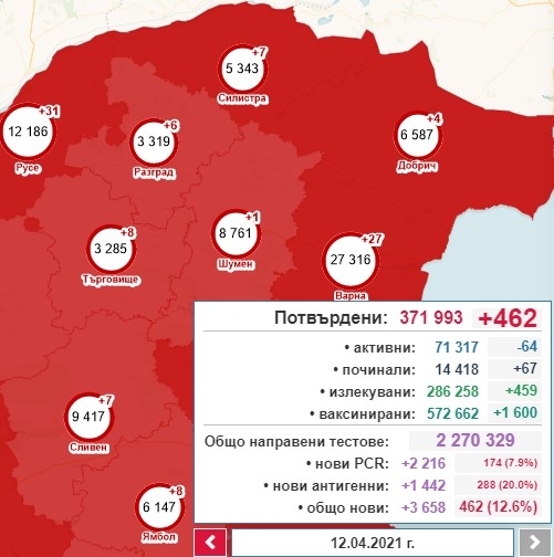 Така общият брой на потвърдените случаи става 371 993, от които активни са 71 317. 459 са излекуваните през последното денонощие, а общият им брой е 286 258. Поставените дози ваксини са общо 572 662, като 1 600 са ваксинирани за денонощието. Хоспитализираните са 10 382, от които 797 се намират в интензивното отделение. Починалите с доказана коронавирусна инфекция са общо 14 418. 67 от случаите са от последните 24 часа.
