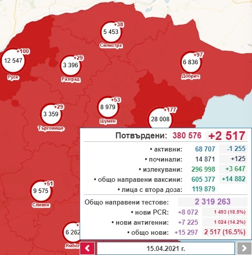 2517, с 427 случая по-малко от вчера, са новодиагностицираните с коронавирусна инфекция през изминалите 24 часа. Това са 16,5% от тестваните. За последното денонощие са направени общо 15 297 теста, oт които 8072 са PCR, а 7225 са с бърз антигенен тест. Това показват данните в Националната информационна система.
