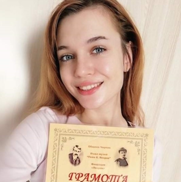 Теодора Георгиева, ученичка от 12.б клас на ПМГ-Силистра, бе отличена с първа награда за стихотворението си ,,Звуци":