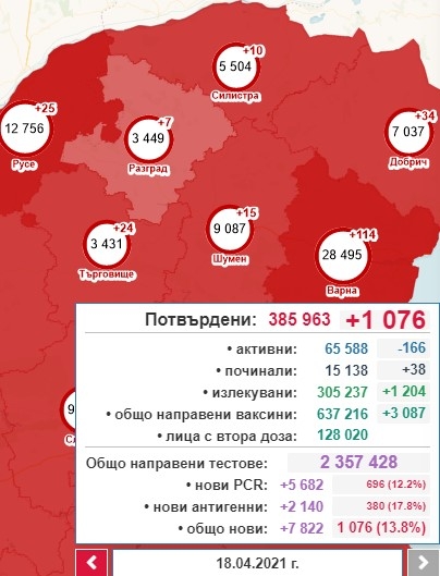 Така общият брой на потвърдените случаи става 385 963, от които активни са 65 588. 1204 са излекуваните през последното денонощие, а общият им брой е 305 237. Поставените дози ваксини са общо 637 216, като 3087 са ваксинирани за денонощието. Хоспитализираните са 9204, от които 797 се намират в интензивното отделение. Починалите с доказана коронавирусна инфекция са общо 15 138. 38 от случаите са от последните 24 часа.