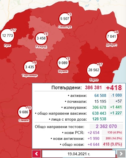 Така общият брой на потвърдените случаи става 386 381, от които активни са 64 508. 1441 са излекуваните през последното денонощие, а общият им брой е 306 678. Поставените дози ваксини са общо 638 443, като 1 227 са ваксинирани за денонощието. Хоспитализираните са 9 229, от които 783 се намират в интензивното отделение. Починалите с доказана коронавирусна инфекция са общо 15 195. 57 от случаите са от последните 24 часа.