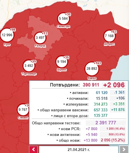 2096, с 338 случая по-малко от вчера, са новодиагностицираните с коронавирусна инфекция през изминалите 24 часа. Това са 15,2% от тестваните. За последното денонощие са направени общо 13 800 теста, oт които 7860 са PCR, а 5940 са с бърз антигенен тест. Това показват данните в Националната информационна система.