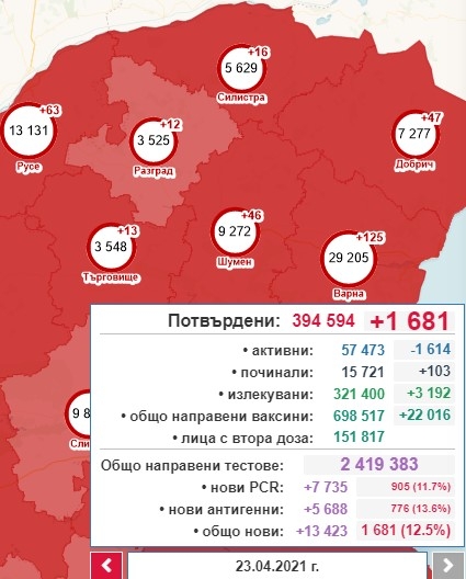 1681 са новорегистрираните случаи на коронавирус у нас за последното денонощие. Това сочат данните в Единния информационен портал, които бяха забавени и публикувани едва около 8 часа тази сутрин, а не както досега - още след полунощ.