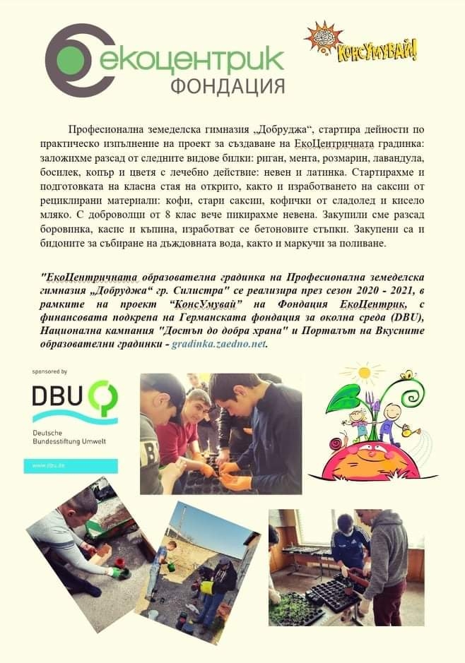 Билкова градина създаде Професионалната земеделска гимназия "Добруджа" в Силистра. Сред растенията преобладават етерично-маслени култури. Учениците са заложили разсад от риган, мента, розмарин, лавандула, босилек, копър. Осмокласниците вече са пикирали невен, планират да засадят още лечебни цветя. Закупени са разсади от боровинки, касис и къпина.
