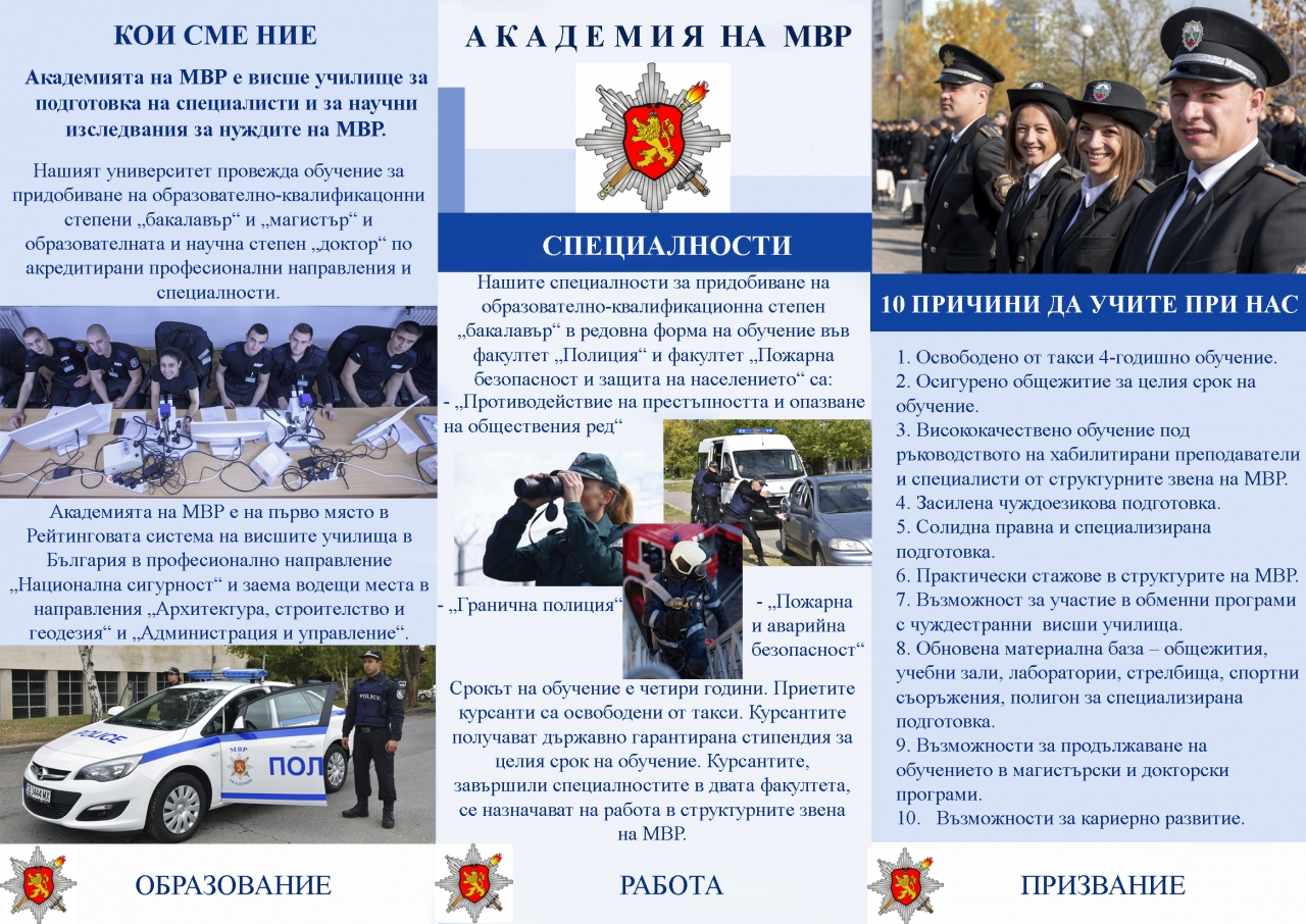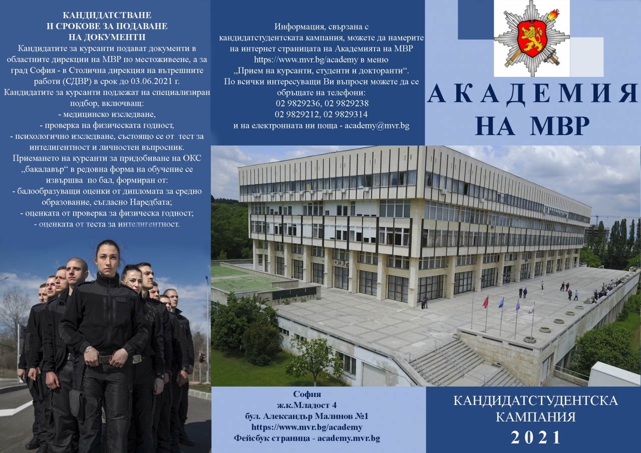 Информация, свързана с кандидатстудентската кампания, е публикувана на интернет страницата на Академията на МВР: www.mvr.bg/academy.