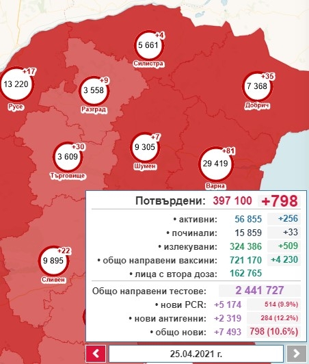 В единния информационен портал са регистрирани само 798 са новите случая на COVID-19 (вчера бяха 1708) за последните 24 часа. Те са установени при направени общо 7493 теста (5174 PCR - 514 положителни, и 2319 антигенни - 284 положителни), което е 10,65% положителни (вчера процентите бяха 11.5% при 14 888 теста).
