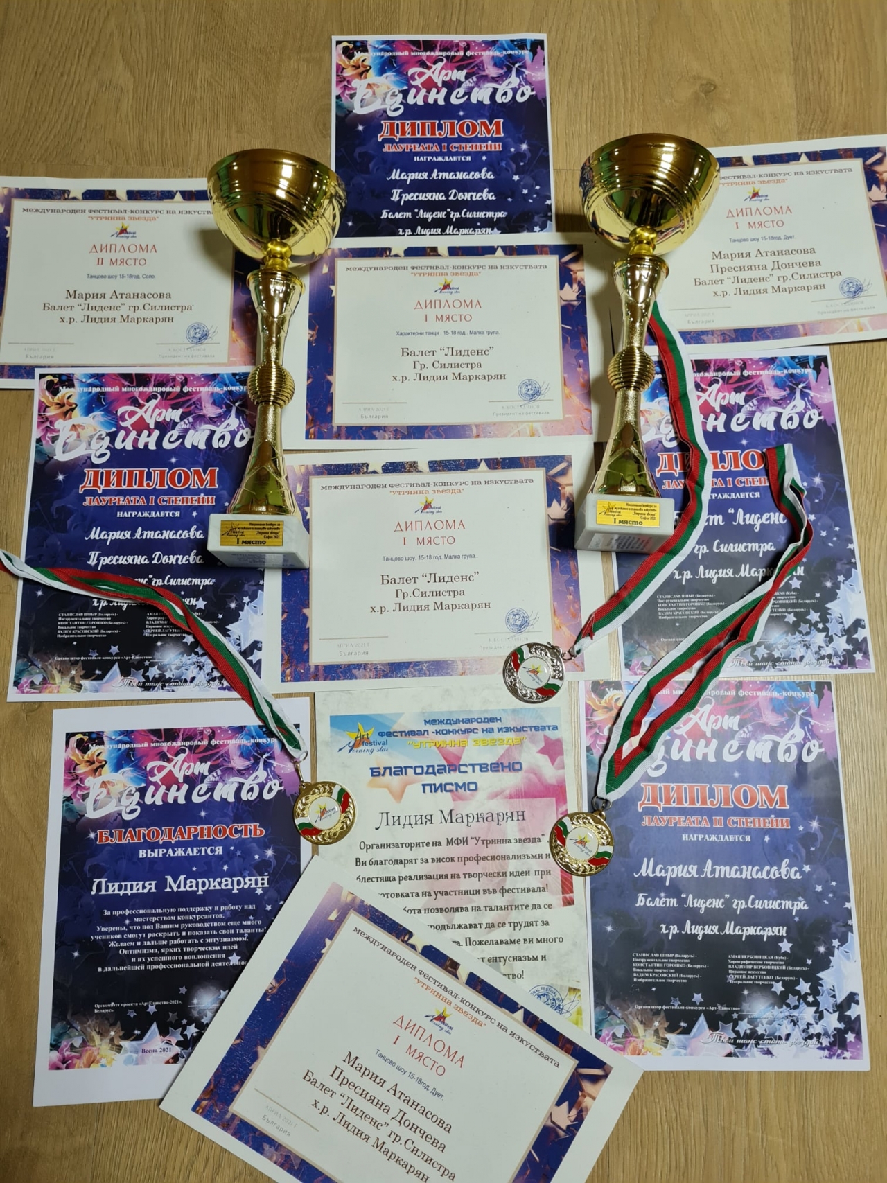 Благодарствено писмо до ръководителя Лидия Маркарян, Благодарност за блестящата реализация на идеи и развиване на таланта на участващата танцова група Мария Атанасова, Пресияна Дончева, Сиана Василева, Илина Няголова, Девора Рамадани.