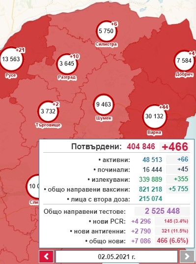 466, със 186 случая по-малко от вчера, са новодиагностицираните с коронавирусна инфекция през изминалите 24 часа. Това са 6,6% от тестваните.