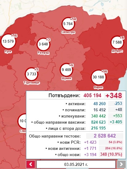 Така общият брой на потвърдените случаи става 405 194, от които активни са 48 260. 553 са излекуваните през последното денонощие, а общият им брой е 340 442.