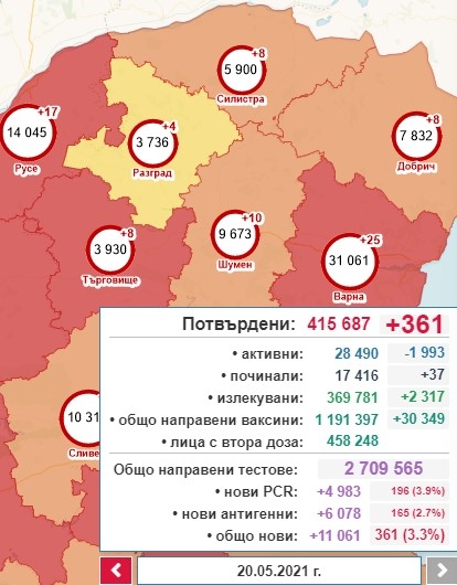 Поставените дози ваксини са общо 1 191 397, като 30 349 са ваксинирани за денонощието. Хоспитализираните са 4 201, от които 460 се намират в интензивното отделение. Починалите с доказана коронавирусна инфекция са общо 17 416. 37 от случаите са от последните 24 часа.