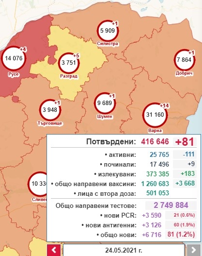 Така общият брой на потвърдените случаи става 416 646, от които активни са 25 765. 183 са излекуваните през последното денонощие, а общият им брой е 373 385. Поставените дози ваксини са общо 1 260 683, като 3 668 са ваксинирани за денонощието. Хоспитализираните са 3 807, от които 402 се намират в интензивното отделение. Починалите с доказана коронавирусна инфекция са общо 17 496. 9 от случаите са от последните 24 часа.