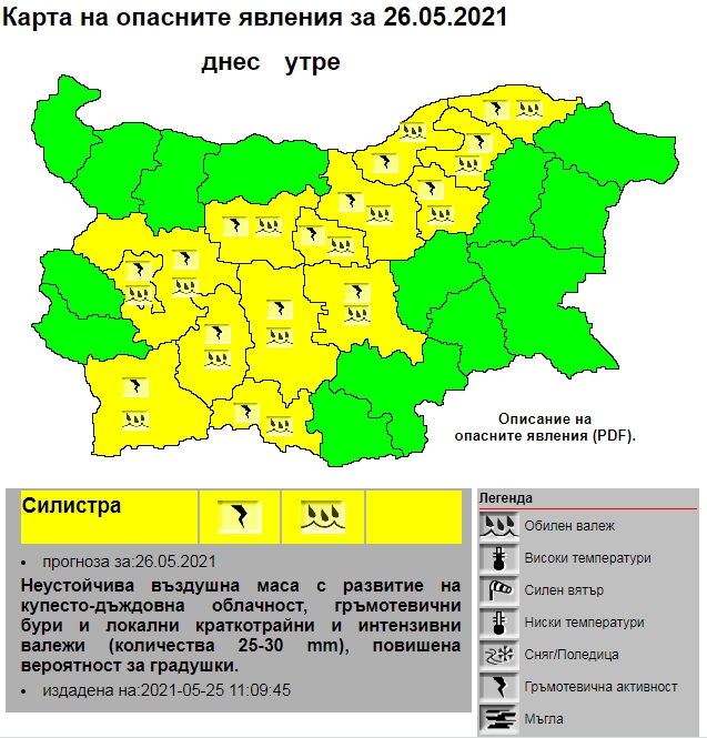 В Силистра и още 13 области от страната е в сила жълт код за значителни количества дъжд, силни гръмотевични бури и опасност от градушки и през нощта, и утре, когато валежите ще продължат.