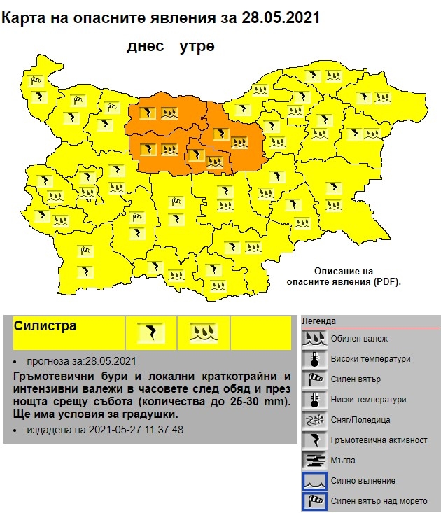 Жълт код за дъжд и гръмотевици в в сила в Силистра и още 12 области на страната. Това съобщава в сайта си Националният институт по метеорология и хидрология (НИМХ).