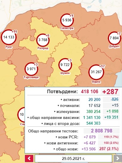 287, с 6 случая по-малко от вчера, са новодиагностицираните с коронавирусна инфекция през изминалите 24 часа. Това са 2,1% от тестваните.